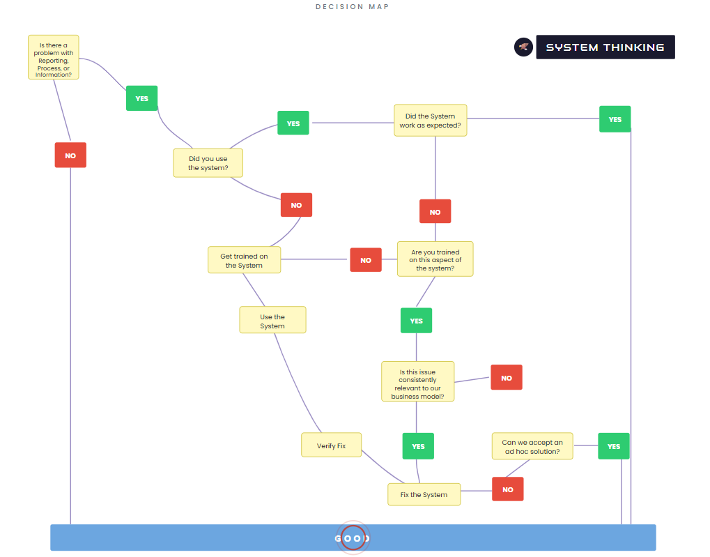 System Thinking is six questions, asked in order. Each question narrows the diagnosis. By the end you know whether you're dealing with an adoption problem, a training gap, a genuine system deficiency, or nothing at all.